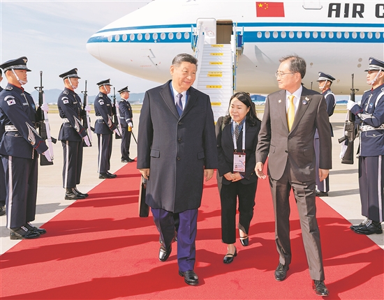 習近平抵達釜山金海國際機場時,韓國外長趙顯等高級官員熱情迎接。禮兵分列紅地毯兩側(cè)致敬,軍樂團演奏行進樂,機場鳴放21響禮炮。