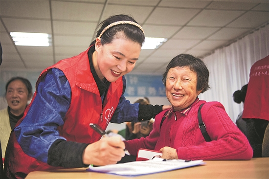 10月29日,在重慶市江北區(qū)五里店街道渝能陽光社區(qū)“享老驛站”,志愿者與老年居民交流并做健康信息記錄。