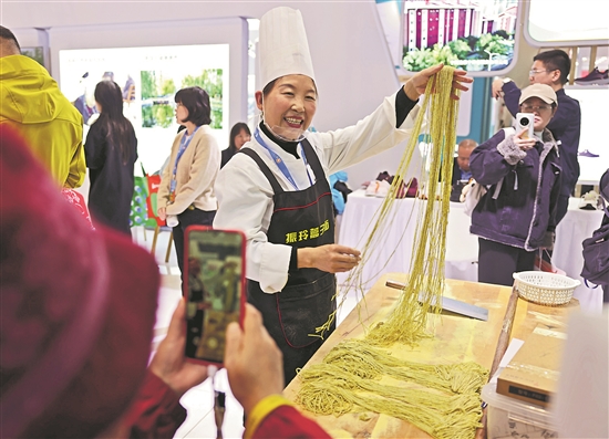 10月29日,在2025年第十一屆北京國際老齡產(chǎn)業(yè)博覽會上,寧夏中寧蒿子面制作技藝國家級代表性傳承人于振玲現(xiàn)場展示切面絕活,得到了現(xiàn)場觀眾的喜歡。