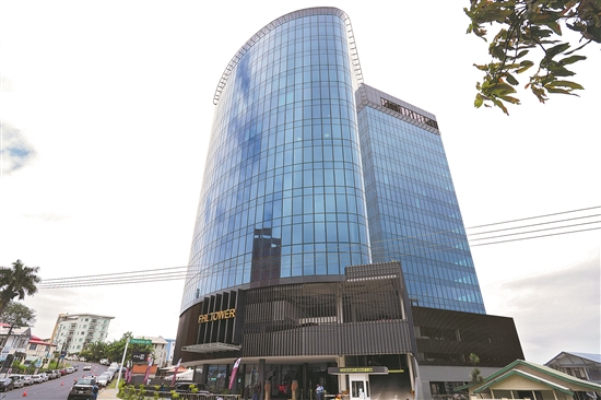 圖為近日在斐濟(jì)首都蘇瓦拍攝的由中國(guó)中鐵一局集團(tuán)有限公司承建的斐濟(jì)首座綠色建筑——FHL大廈。