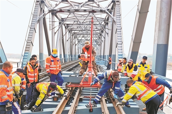 為保證橋枕順利更換,齊齊哈爾工務(wù)段齊齊哈爾路橋車間班組自制吊軌平車,全新的動(dòng)力系統(tǒng)不再需要職工費(fèi)力搬運(yùn),繩索懸掛裝置完全解決橋上作業(yè)空間不足的困境。自制吊軌平車投入使用后,大橋換枕效率提升3倍,人力節(jié)省60%。劉楊 攝